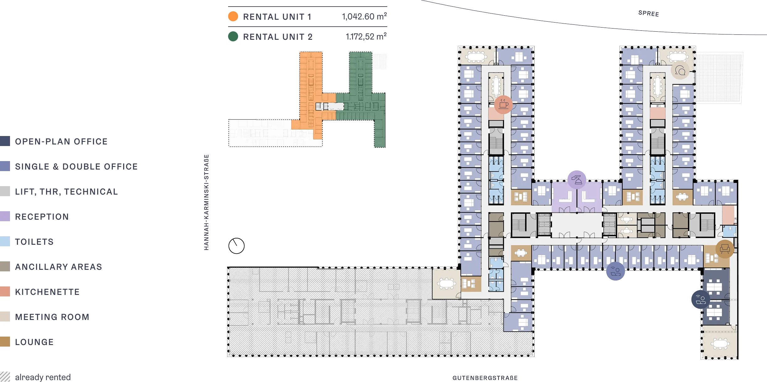 The design and furnishings of the interior are geared towards the well-being of the users. Spreesight thinks office further. In the Deli on the first floor, on the terraces, in the inner courtyard or on the banks of the Spree, it offers places for communication and relaxed working. An open structure makes it possible to create spaces as desired – from private offices to open spaces for collaborative work. The spaces can be flexibly adapted to changing needs.