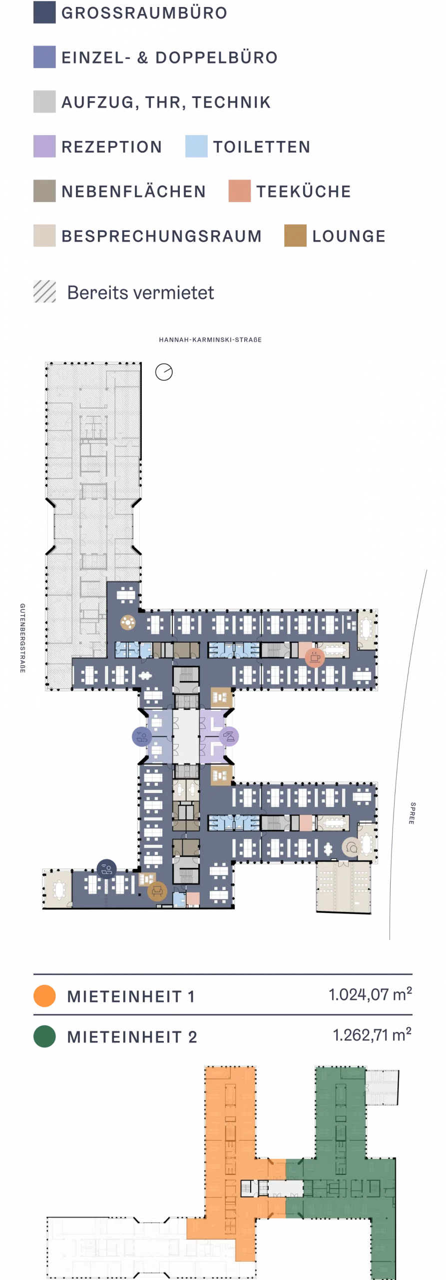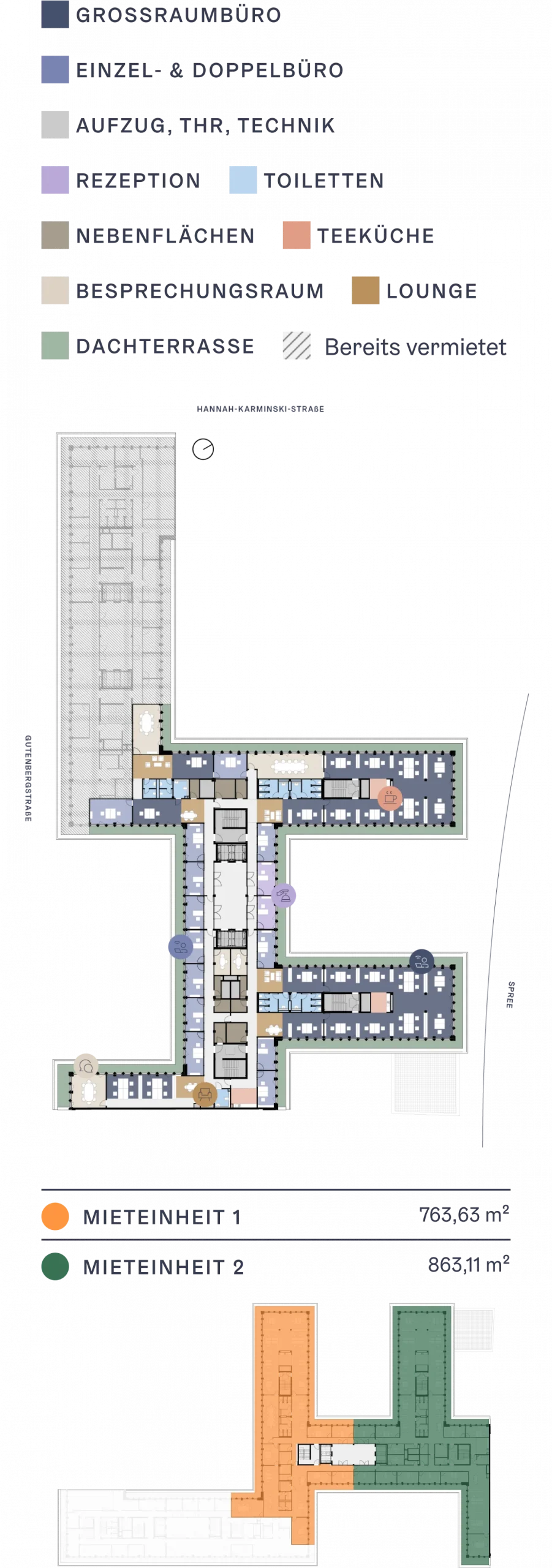 Gestaltung und Ausstattung des Innenraums sind auf das Wohlbefinden der Nutzerinnen und Nutzer ausgerichtet. Spreesight denkt Büro weiter. Im Deli im Erdgeschoss, auf den Terrassen, im Innenhof oder am Spreeufer bietet es Orte für Kommunikation und entspanntes Arbeiten. Eine offene Struktur ermöglicht Räume nach Wunsch – von Privatbüros bis zu Open Spaces für kollaboratives Arbeiten. Die Flächen können flexibel veränderten Bedürfnissen angepasst werden.